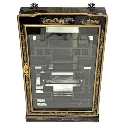 - Chinese Black Lacquer, Wooden cabinet ,Mirror back, Glass front, Brass Hangar included