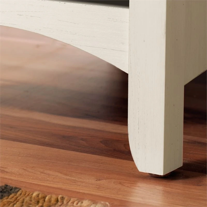 - Tapered legs, curved base rails and decorative wood accents inspired by timeless mission style