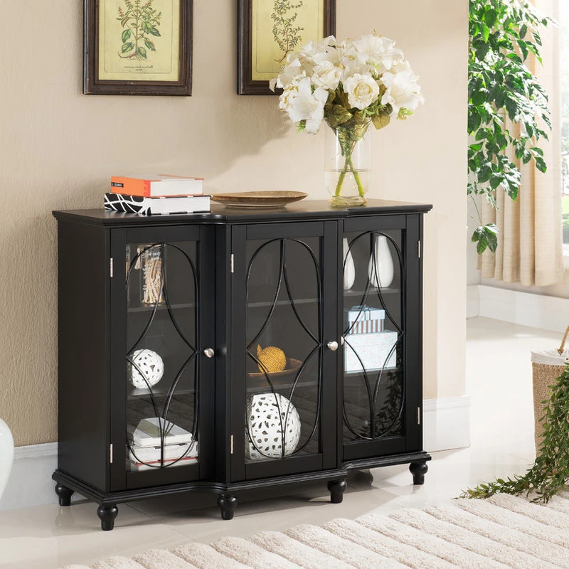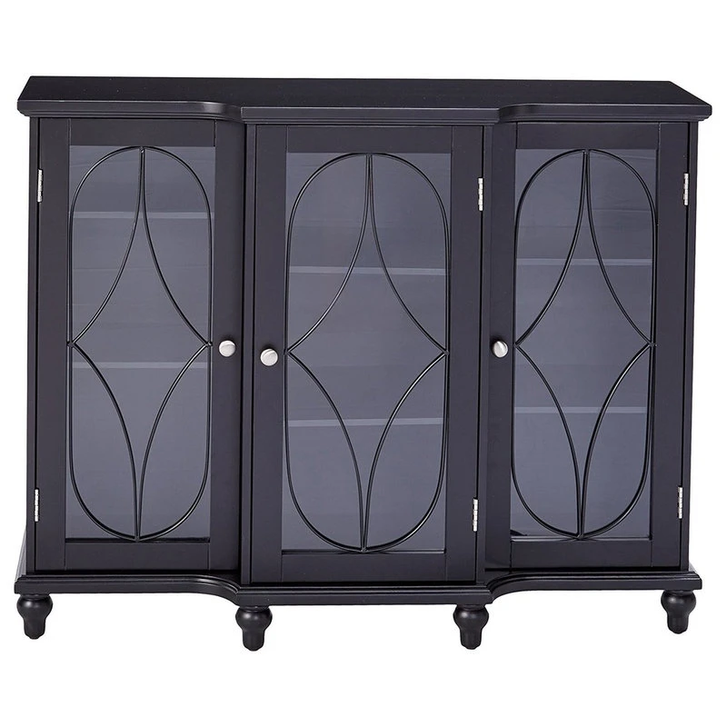 Serve up a sophisticated design with help from the Boyce Buffet. This versatile storage piece is equipped with a pair of adjustable shelves that are set behind three decorative glass panel doors, so you can display and store china and serveware in the dining room. Already got that covered? Use it for showing off decor in the entryway or collectibles in the living room. The sleek black finish is elevated with shining silver hardware and attractive bun feet. With its classic details, the Boyce fits well with your transitional design.