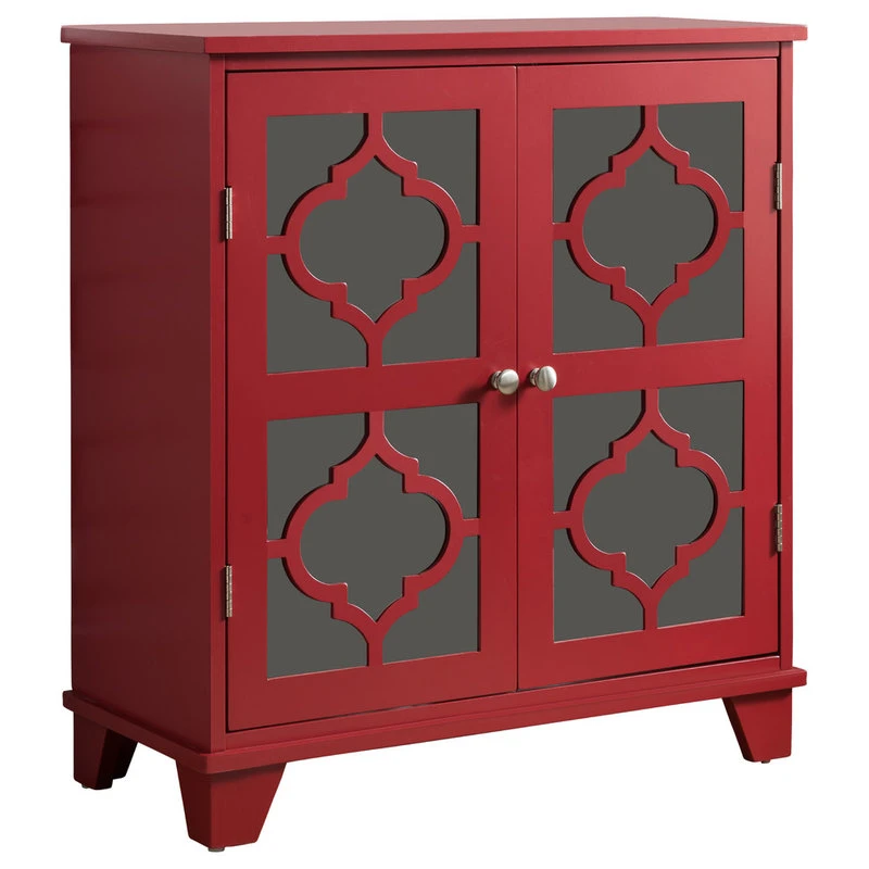 Caelan 2 Door Entryway Accent Display Cabinet With Storage Shelf & Glass Doors, Red Wood, Contemporary. Accent your space with the Caelan Accent Cabinet where storage meets style and is a must-have for updating and organizing your abode. Its two knob doors offer glass panels with geometric overlays, while an inner stationary center shelf is perfect for tucking away linens, tablecloths, placemats, and much more.