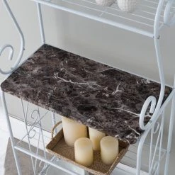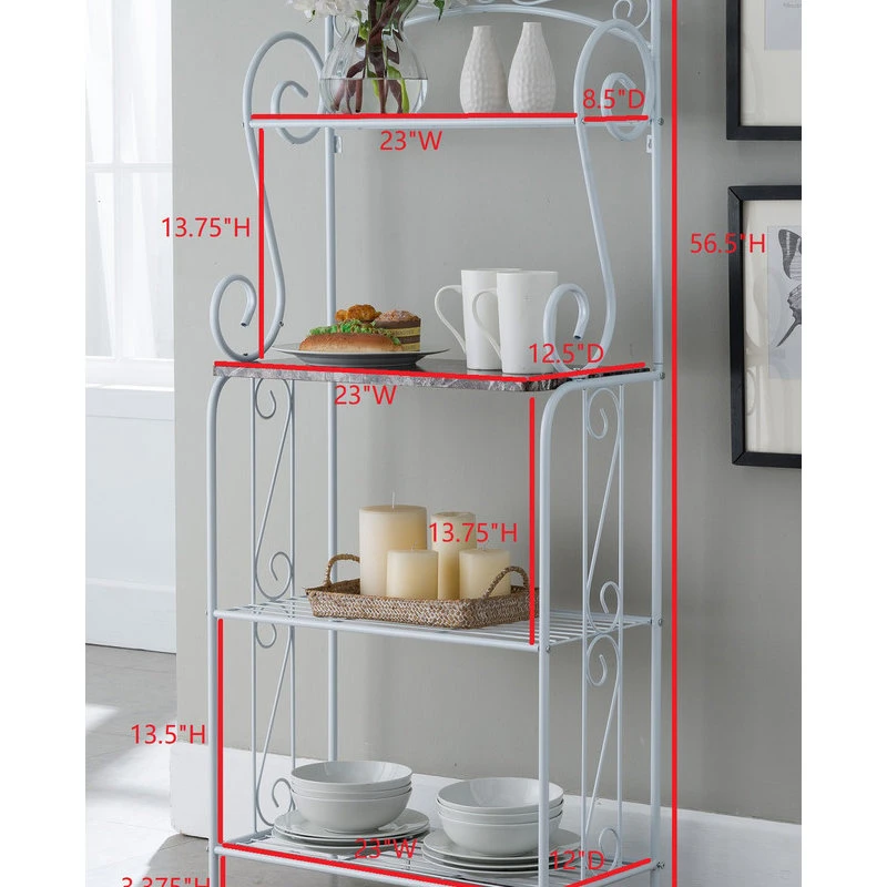 Destin 4 Tier Free Standing Kitchen Bakers Rack, White Metal Frame & Marble Wood Center Shelf, Transitional. Give your hallway or kitchen stylish storage with the Destin 4 Tier Bakers Rack. Transitional in style, this piece features a white finish frame and a marble finish wood center shelf.