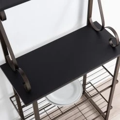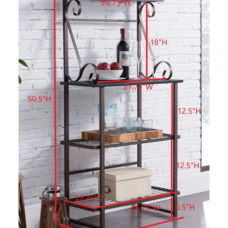 Kalamazoo 4 Tier Free Standing Kitchen Bakers Rack, Pewter Metal Frame & Black Wood Center Shelf, Transitional. Give your hallway or kitchen stylish storage with the Kalamazoo 4 Tier Bakers Rack. Transitional in style, this piece features a pewter finish frame and a black wood center shelf.