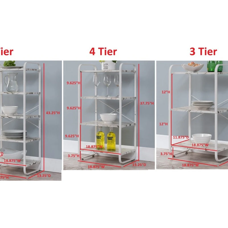 - Height Between Shelves: 3 Tier: 12″H, 4 Tier: 9.5″H, 5 Tier: 8.5″H