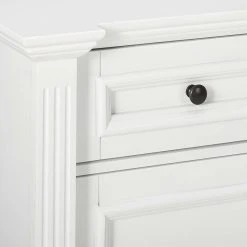 White Wood Contemporary Sideboard Buffet Console Table With Storage Cabinets, Drawers, Shelves. Add a sophisticated look to your contemporary aesthetic with this handsome three-drawer console table, showcasing a rich white finish. Its sleek rectangle silhouette blends effortlessly into any casual or formal space, while its door panels add a shimmering touch to your decor. Play up this console table’s contemporary influence by adding it to a living room arrangement alongside a sofa and matching chairs for a cohesive space, then roll out a rug underfoot to tie the space together with a pop of pattern. Its interior space is perfect for stowing everything from spare table linens to heirloom dinnerware, while its top can be used as a canvas for a trio of vintaged glass vases.