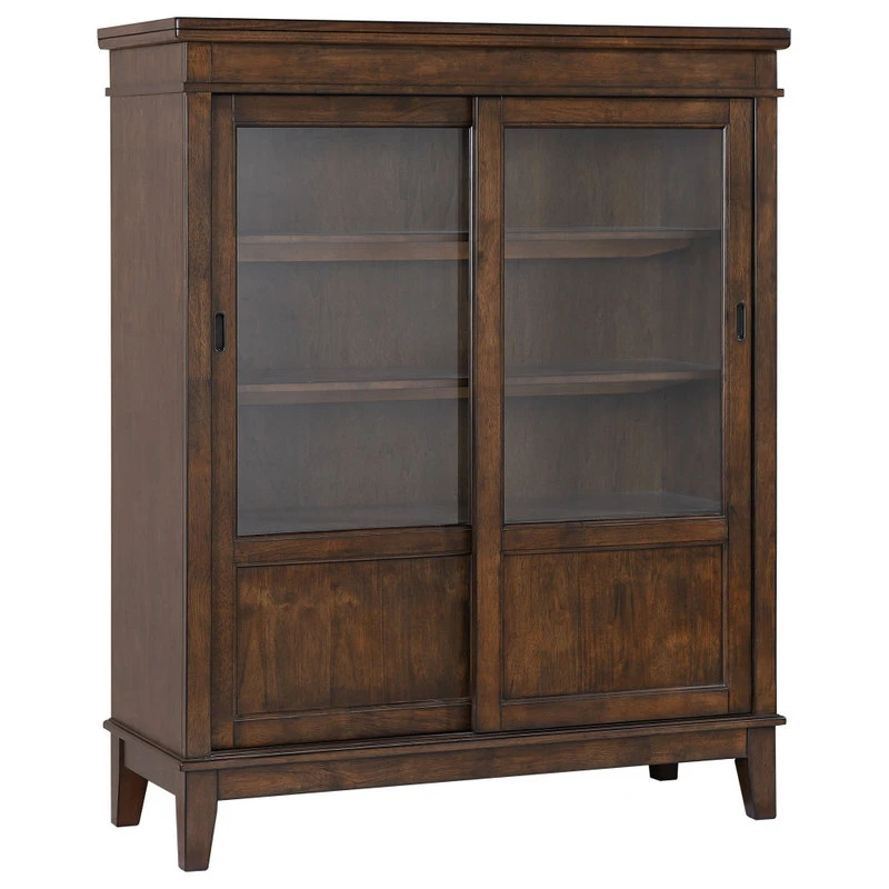 Mindy Cherry Wood Contemporary Curio China Display Cabinet with Storage Shelves. Complete your dining room or living room with this charming Mindy Curio Cabinet the perfect piece to show off your collections! Crafted of solid wood and veneers, it features sliding glass-paneled doors with plenty of storage space for displaying rows of your favorite reads, mementos collected on fondly-remembered vacations, and framed photos of families and friends while the hidden drawers down below allow you to tuck away any clutter while keeping them close by. Finished in warm cherry with a clean design, allowing it to blend in a variety of aesthetics.