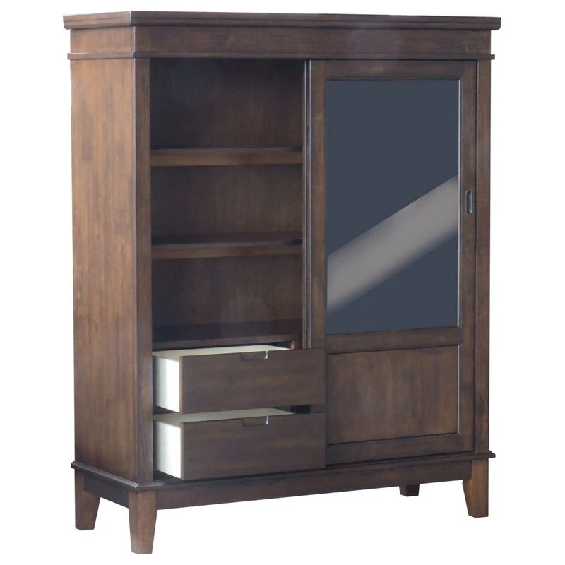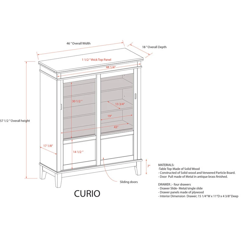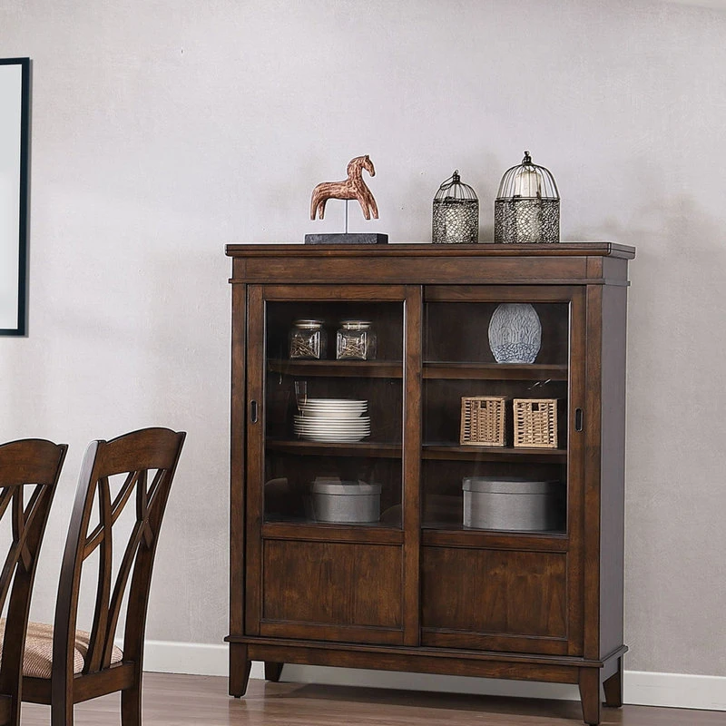 - Materials: Solid Wood Top; Wood Veneer; Plywood and Glass Doors