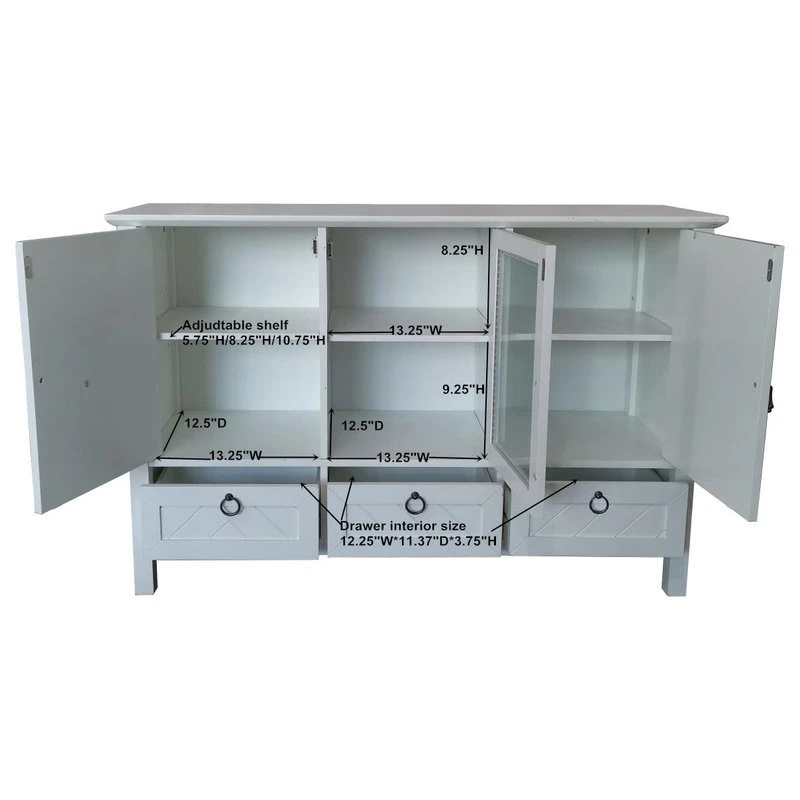 Providence Sideboard Buffet Console Table With Storage Cabinets, Drawers & Shelves, White, Wood & Glass, Contemporary. Add a sophisticated look to your contemporary aesthetic with this handsome three-drawer Providence Sideboard Buffet, showcasing a rich white finish. Its sleek rectangle silhouette blends effortlessly into any casual or formal space, while its door panels add a shimmering touch to your decor. Featuring an adjustable shelf behind each cabinet door for customizable storage helping you keep items like special occasion dinnerware or large serving pieces in the cabinets. Meanwhile, three lower drawers offer plenty of space to tuck away any loose items you donβt want on display, while its spacious top provides a spacious stage for some decorative trinkets.