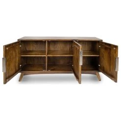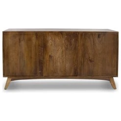 The Seine Sideboard brings a wealth of character to your dining area. A simple mid-century silhouette lets the textured chevron surface take center stage, while natural variations in the mango wood construction showcase variations in tone that make the intricate pattern all the more dynamic. Angled legs, discreet handles, and a walnut finish add a light touch, while three doors open to reveal ample storage for all your dishes and serveware. Statement style and savvy storage in one timelessly beautiful package.