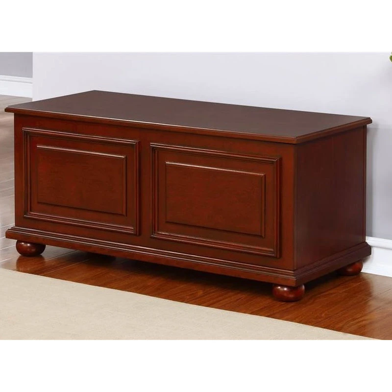 Simply classic, this cherry cedar chest is the perfect addition to your home decor. Blending style and function with raised panels, decorative molding, bun feet, and a rich cherry finish. The top opens wide to reveal ample storage space and is cedar lined. Safety is a priority with child safe hinges and breath holes. Some assembly required.