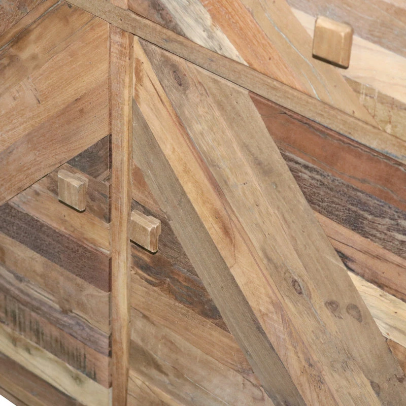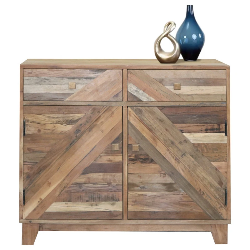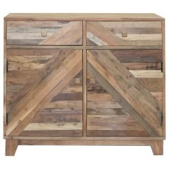 Fun and creative pieces to spice up any space. Constructed of reclaimed wood and MDF. Hand crafted wood patterned design in diagonal shapes creating a transitional style. Great for those more modern looks. The chest has 2 drawers and 2 cabinets with interior shelves providing generous hidden storage.