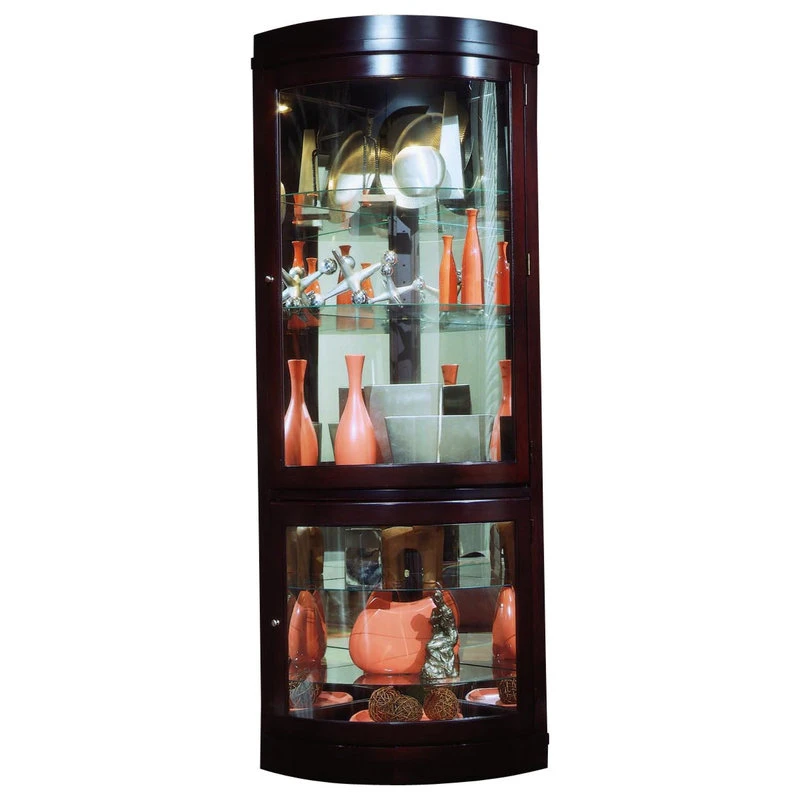 For a stylish way to display china or other keepsakes, the Pulaski Chocolate Cherry Corner Curio is a simple yet modern corner curio. It its perfectly in the corner of any room or hallway and features a rich, dark cherry finish to complete the look of any display.