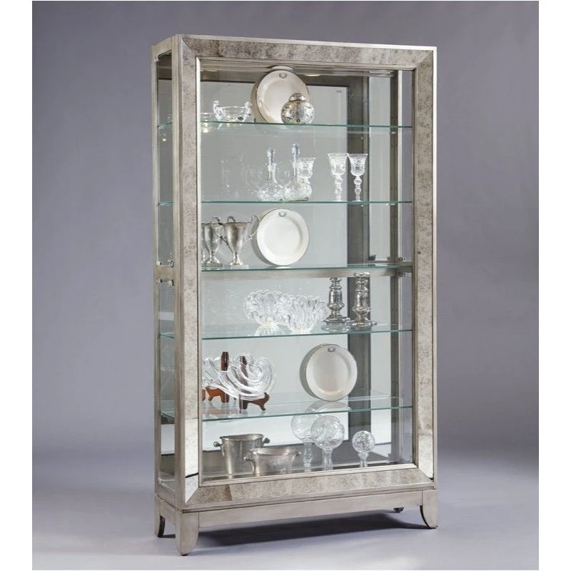 Be in touch with this antique style Side Entry Curio in Platinum Finish by Pulaski Furniture. Our Side Entry Curio is built in with front frame inserted with an antique mirror. It features elegant arched beveled glass on the front. The curio includes a mirrored back, halogen can lights, and adjustable glass shelves.