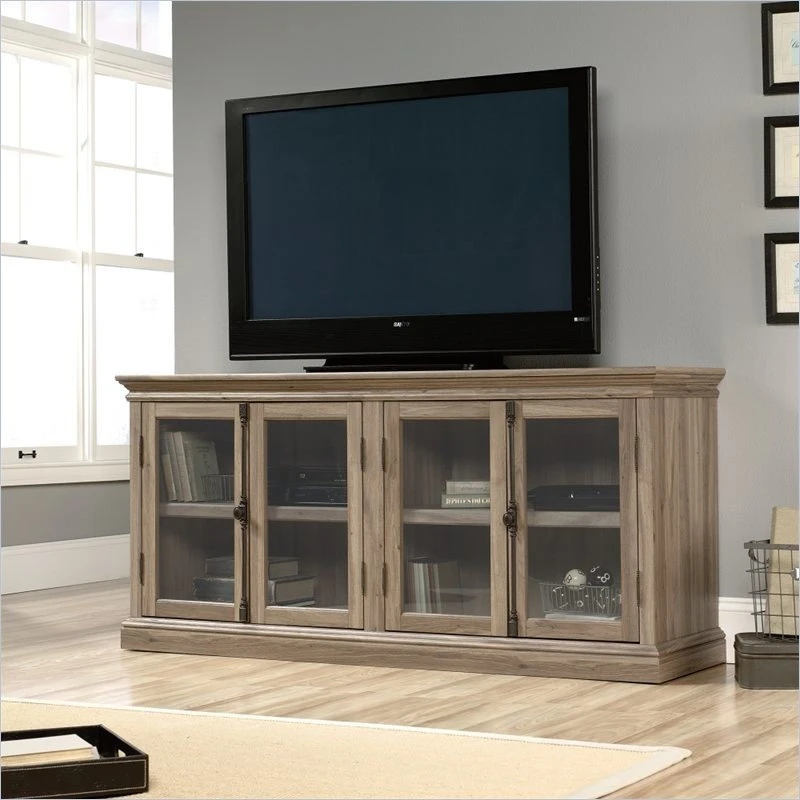 It’s time for a home upgrade. Add charming style and a beautiful aesthetic to any room in your home with this credenza from the Barrister Lane® collection. It features a spacious top surface that provides you with ample room to display your favorite home décor items like your array of knick-knacks, decorative plants, an accent lamps and photos of your family too. Its spacious top surface also accommodates up to an 80” TV, making it the perfect spot to cozy up around to have all-day movie marathons or binge watch your favorite show with your friends. Behind each set of framed, safety-tempered glass doors is a large adjustable shelf that can move to different heights to create flexible storage options for items of all shapes and sizes. The enclosed back panel includes cord access so you can keep all your wires neat and out of the way. Finished in Salt Oak® and detailed with stylish hardware, this stunning credenza is everything your home needs.