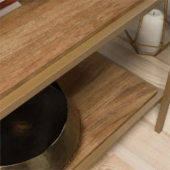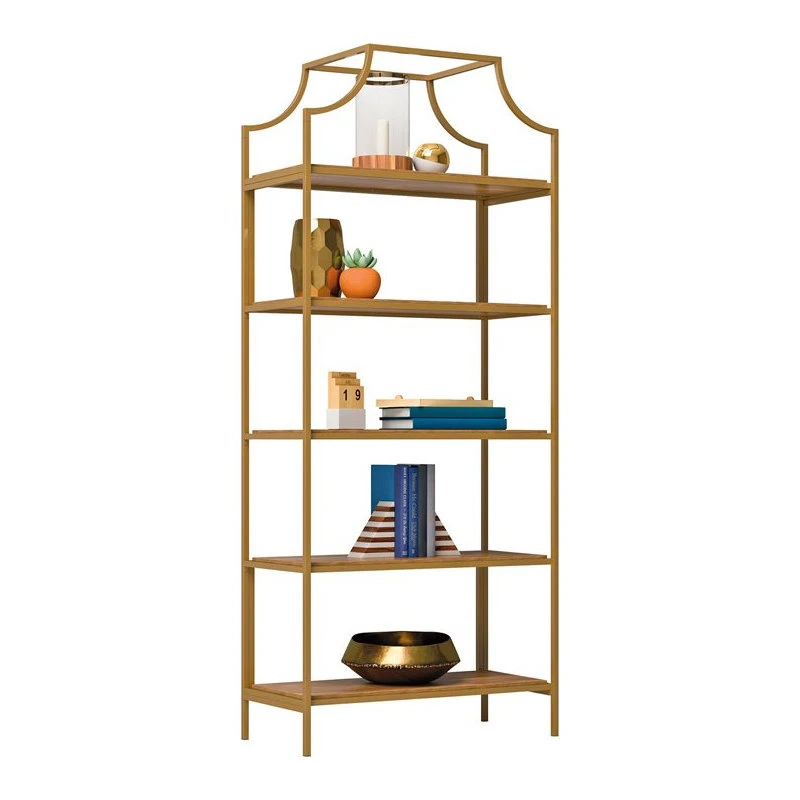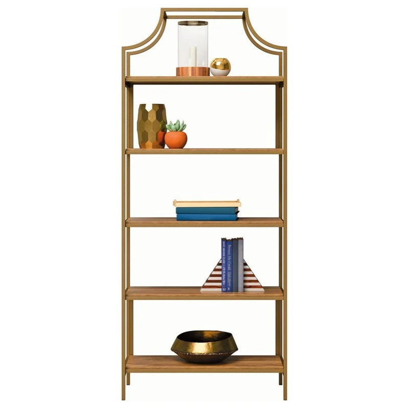 When you look around your home, you want to find your most loved items displayed on something that is as special as your memories are. Honor those treasured objects and your home with this 5 shelf bookcase from the International Lux collection. Finished in Sindoori Mango®, five levels of open shelving are dedicated to being the perfect place for your favorite books, cherished décor or treasured vacation mementos. This tall metal frame bookcase adds the perfect amount of functional luxury to your home. Featuring elegant style with modern design, this modern bookcase is structured with a sleek metal frame in Satin Gold finish. Its rounded edges and curved indent shape give this display bookcase a stunningly unique appearance that is sure to grab the attention of your friends and family. Your home, and your belongings, deserve simple function without losing elegant sophistication. Out with the old and in with the new with this open shelf bookcase perfect for nearly any setting.