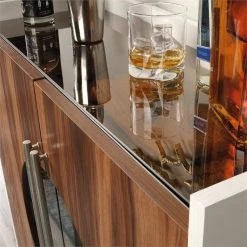 - Adjustable, safety-tempered glass shelf behind doors offers flexible storage options.