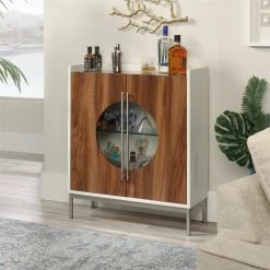 Add a touch of coastal-inspired design and beauty to any room in your home with this accent cabinet from the Vista Key collection. This storage cabinet features two doors with glass inserts that create a beautiful look that is sure to stand out in your home. Behind these doors is a storage area that includes an adjustable, safety tempered glass shelf that can be moved to different heights to create flexible storage for items of all shapes and sizes. Store and display anything from stacks of books and work binders to decorative seashells and picture frames. This accent cabinet also features a hidden drawer behind the doors that functions as a shadow box underneath the amber-tinted glass display top. This storage cabinet is accented with metal pulls and base framing in a brushed nickel finish. Itβs also finished on all sides for versatile placement throughout your home. Finished in Pearl Oak with Blaze Acacia accents, this one-of-a-kind accent piece is everything your home needs and more.
