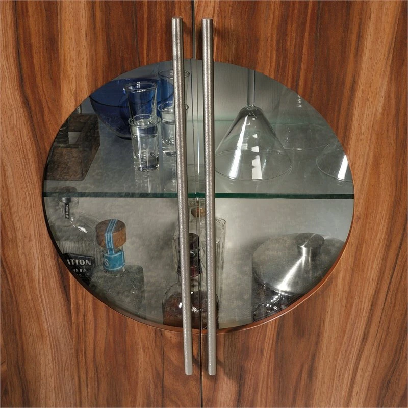 - Accented with metal pulls and base framing in brushed nickel finish.