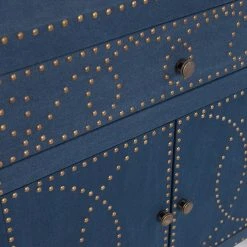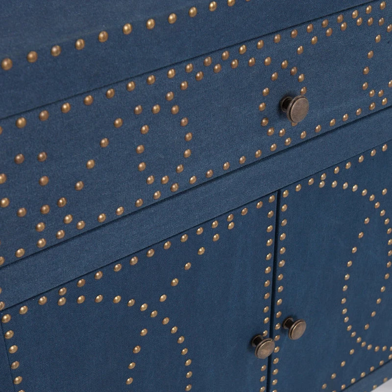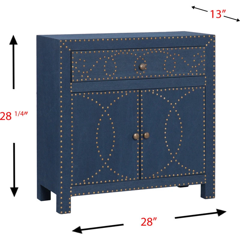 Includes one drawer and one double door cabinet with one removable shelf. Eclectic coastal style. Embellished with a studded nail head. Interior lined with black non-woven fabric. Metal drawer guides for smooth access. Soft navy linen with brass and antique bronze accents. Made from MDF and polypropylene. Made in China. Top: 28 in. W x 11.75 in. D. Drawer: 22.75 in. W x 9.5 in. D x 3.75 in. H. Cabinet: 24.5 in. W x 11 in. D x 15.5 in. H. Shelf: 24.5 in. W x 10.75 in. D x 7.5 in. H. Top weight capacity: 40 lbs.. Drawer weight capacity: 10 lbs.. Cabinet shelf weight capacity: 30 lbs.. Removable shelf weight capacity20 lbs.. Overall: 28 in. W x 13 in. D x 28.25 in. H (47 lbs.). Assembly Instructions. Bring out your seaside sweetheart with this intricately detailed yet fantastically functional double-door cabinet. This versatile storage cabinet lives anywhere from family room to bathroom, entryway, or even hallway for home organization happiness.