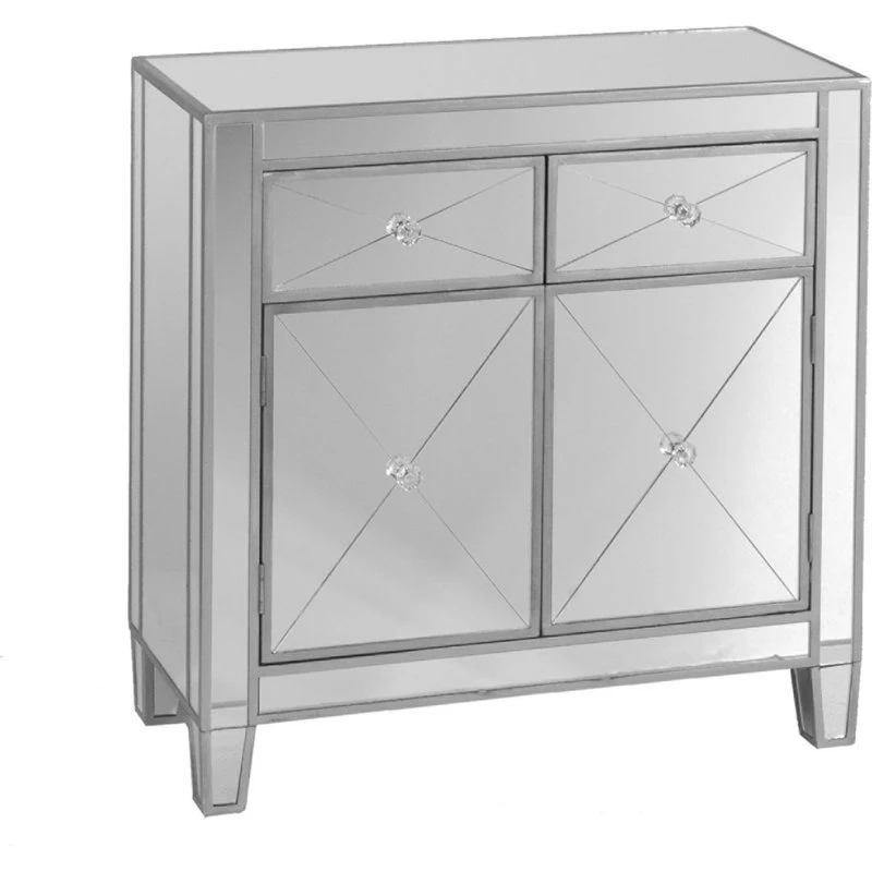 Fight off flashes of paparazzi cameras with this glamorous, mirrored double-door cabinet. Bathed in glistening silver from head to toe, this cabinet contains two drawers and a spacious interior compartment for bounteous storage of life’s various accoutrements. Graceful scoring of the shimmering mirrors fashions multi-faceted splendor and the crystal style knobs evoke 1930s opulence; place in the hall, dressing are or entryway to bring a piece of the fabulous life home.