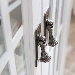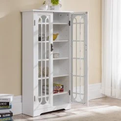 With a fresh, clean look, this elegant windowpane media storage cabinet becomes the centerpiece for any room. Detailed lines traverse the glass doors, providing the perfect place to display DVDs, entertainment accessories, or other trinkets. Inside, the center shelf is fixed, while an additional four shelves fully adjust to suit your needs. Pique your guest’s curiosity with this curio-style media cabinet.