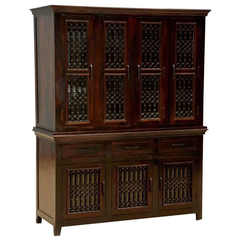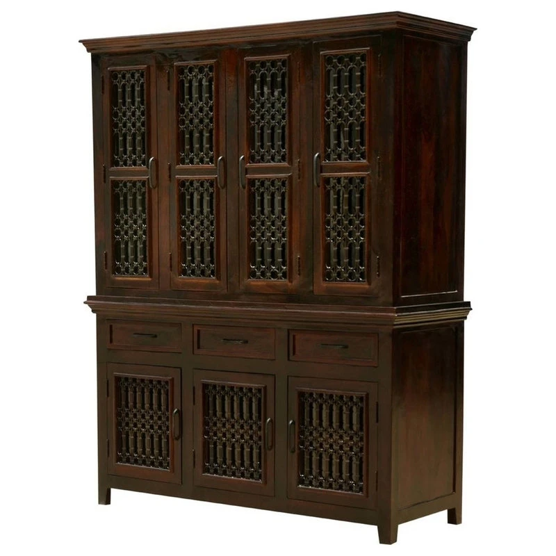 Elevate your dining room or study with traditional elegance. The Harold Traditional Rustic Solid Wood Iron Grill Dining Room Hutch is handcrafted to create an exceptional storage system. Ornate iron grillwork is in all the cabinet doors. The bottom dining buffet section includes a large double door 2-shelf cupboard, a single 2-shelf side section and three drawers. Four doors open onto the large 2-shelf hutch section. This grand breakfront dining buffet hutch is built with solid Rosewood, a premium hardwood ideal for furniture due to its strength and durability. Special Features: • 100% Handcrafted, Dining Buffet Hutch • Solid Rosewood construction • Large hutch with 4 doors and 8 shelves • 3 large drawers • Buffet section with 3 cabinet doors • Elegant iron grillwork on doors • Hand rubbed stain and finish • Solid Wood back • Finished interior • Stands off the floor on short and sturdy feet • Heirloom quality • Easy to clean and maintain Note: Real wood is a product of nature, and as such, no two pieces are alike. Variations in solid wood grain patterns are to be expected and make each furniture uniquely beautiful, just like us humans.