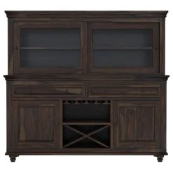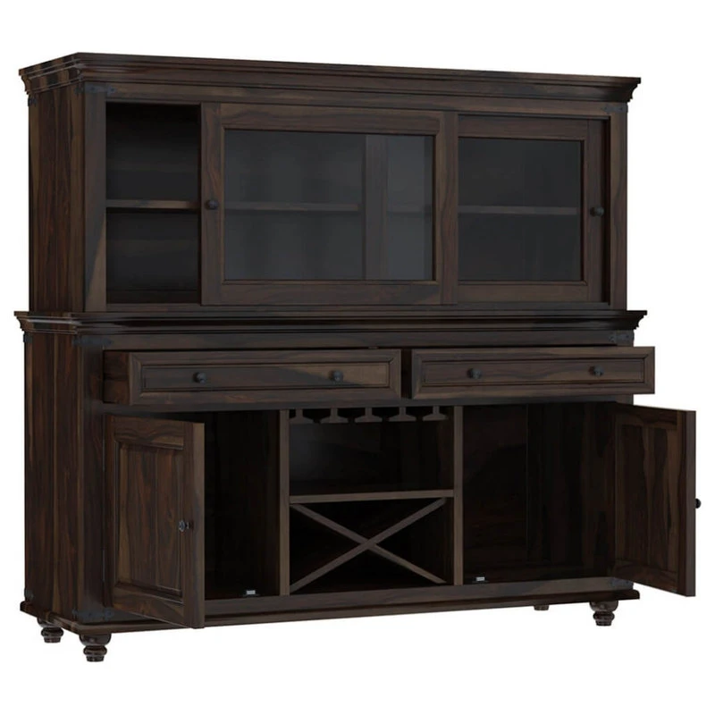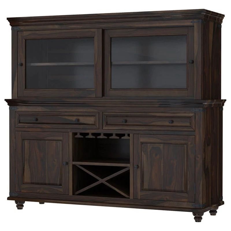 Let our multi-functional Oklahoma Farmhouse Traditional Rosewood Buffet with Hutch & Glass Doors inspire your dining room decor and your entertaining personality. Create scale, add ease-of-use comfort, and impeccable style to your home with this handsome buffet hutch. The hutch is perfect for displaying your favorite dishware or heirloom china with sliding glass-front doors that will highlight everything within. The buffet has ample space for holding all of your household necessities so that everything you need to serve for any scale meal is right at your fingertips. The two drawers and two cabinets are perfect for concealing items you’d rather leave out of sight. At the center is an “X” style wine bottle holder as well as a stemware rack. Founded atop turned, bun-style feet, this stately dining room bar hutch is made of beautiful solid rosewood in stunning espresso finish that displays a host of intricate grains and bands. The millwork detail is exquisite throughout, featured atop the hutch as well as along the buffet. Handcrafted by Old World artisans, the craftsmanship is what you would find in your favorite heirlooms, resulting in high quality to last through generations of use. Complete the look when pairing with our Oklahoma Dining Table and Chairs and Sideboard. Special Features: • 100% Handcrafted • Made of solid rosewood • Metal brackets decorate the corners • Organic wood grain patterns • Glass sliding doors on hutch • Two drawers • Two base cabinets • “X” style wine bottle holder • Stemware rack • Part of the Oklahoma Collection Note: Real wood is a product of nature, and as such, no two pieces are alike. Variations in solid wood grain patterns are to be expected and make each furniture uniquely beautiful, just like us humans.