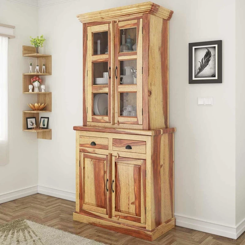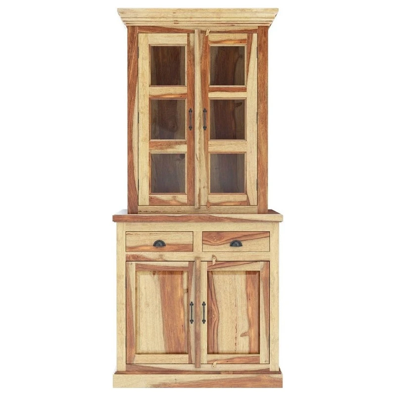 Take care of your dining room storage needs with the Ostrander Rustic Solid Rosewood Small Dining Room Hutch China Hutch Cabinet. The classic rustic style hutch comes with a two door glass cabinet on the top, opening to three large spacious shelves to display china and dinnerware. The two drawers in the center are ideal to store, bottle openers, napkins, and other smaller items. The bottom wooden door cabinet is ideal to tuck away larger dining essentials including serveware or cookware. Center this tall solid Rosewood small kitchen hutch on a wall in your dining room or perhaps at the breakfast nook in your kitchen not only to extend storage space but also to augment the room dΓ©cor. This solid wood dining room hutch is handcrafted with solid Rosewood that offers durability for a lifetime. The natural wood grain pattern of the Rosewood offers this dining room hutch a distinctive rustic charm. Special Features: β’ 100% Handcrafted, Small Hutch β’ Solid Rosewood construction β’ Unique natural wood grain pattern β’ Two drawers β’ Glassdoor hutch with three shelves β’ Bottom cabinet with two large shelves Note: Real wood is a product of nature, and as such, no two pieces are alike. Variations in solid wood grain patterns are to be expected and make each furniture uniquely beautiful, just like us humans.