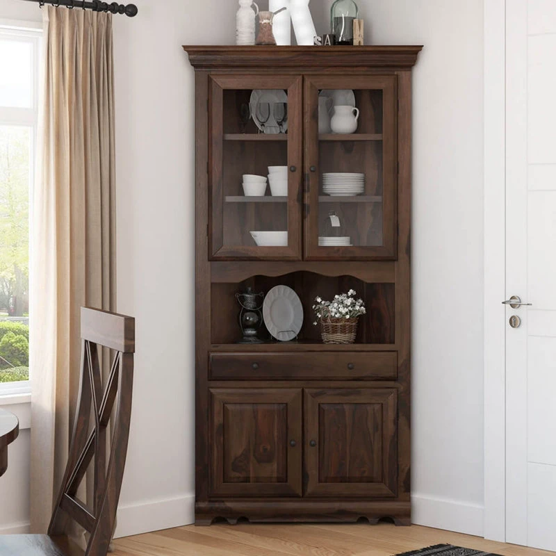 When space is at a premium, but storage and style are top of your list, our Tiverton Rustic Solid Wood Corner Hutch with Glass Doors saves the day! This space-saving corner hutch cabinet commands minimal floor space while delivering ample storage with rustic style. Adorned in delicate trimwork, the details of this wooden farmhouse hutch continue in the organic motif of grains and bands that naturally stamp the solid wood. When it comes to storage, this hutch has it all. At its base, double doors open upon interior shelving for enclosed organization. Just above, a single drawer slides open to accommodate anything from silverware to table linens. For the collector or individual looking for a little extra surface space, the open middle shelf creates a nice little nook to suit just about any purpose. Topping these features is the glass-front double door cabinet. Ample shelf space provides a proper place to display your cherished heirlooms or dinnerware. This rustic corner hutch is a quality constructed treasure that will delight generations to come in solid wood born from Old World techniques and trades. Timeless in appeal with that distinct heirloom charm, this hearty piece of furniture will complement your home in effortless style. Special Features: • 100% Handcrafted • Made of solid wood • Hutch Cabinet with solid doors and shelf space • Cabinet with display glass and shelf space • Open shelf • Single drawer