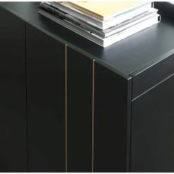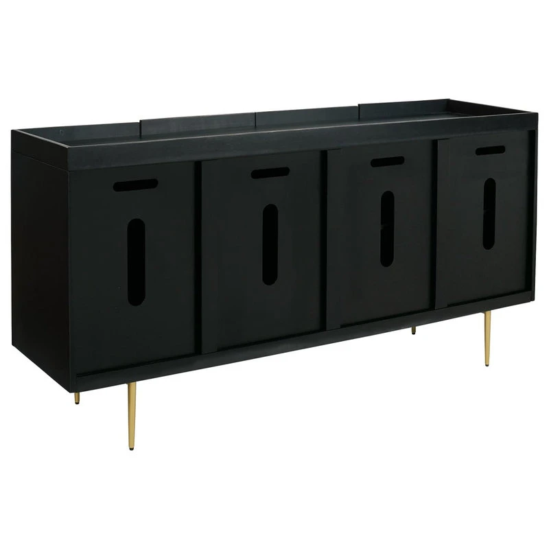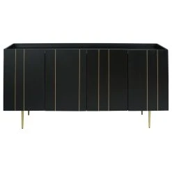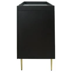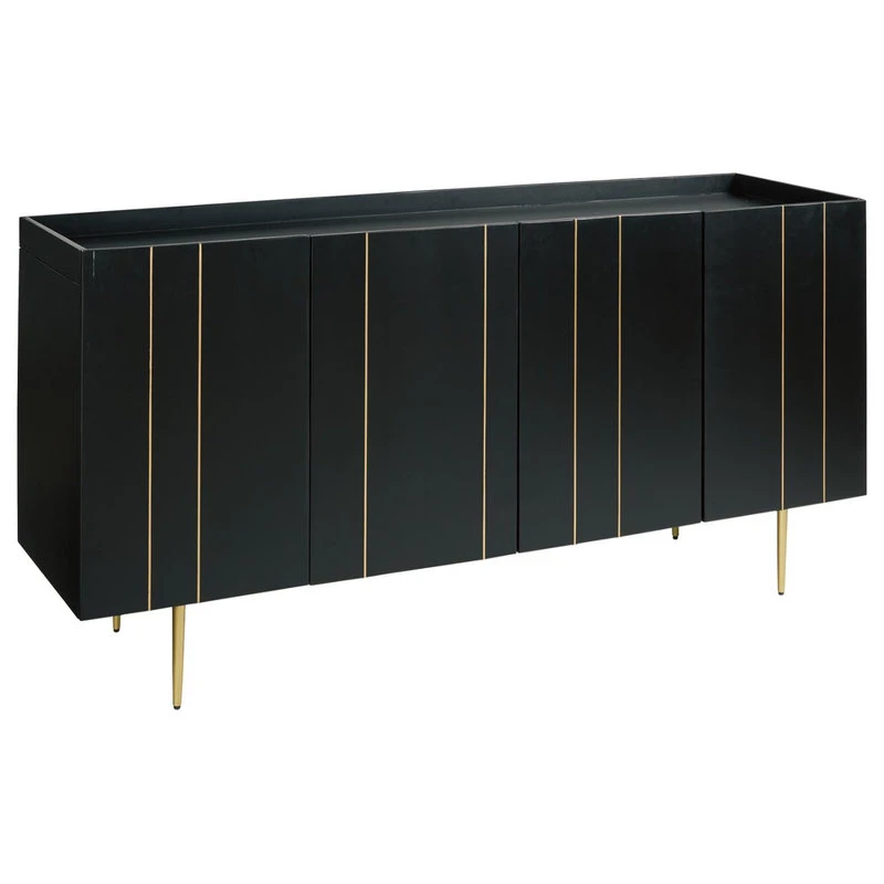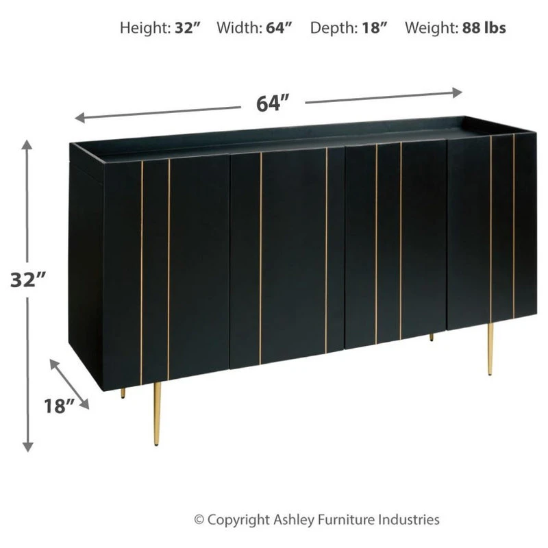 The Brentburn accent cabinet is beautifully aligned with your love of contemporary style with a high-glam twist. Finished in brilliant black, this quality crafted accent cabinet is enriched with thin brass inlays and tapered metal legs in a brass-tone finish for upscale appeal.