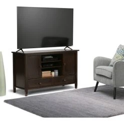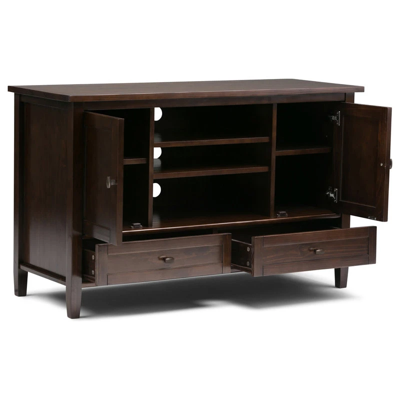 Having just purchased your dream large flat screen TV – you need the perfect TV Stand to enhance your viewing pleasure. Look no further. The Warm Shaker TV Stand is perfectly sized for TVs upto 50 inches. The 29 inch height puts the TV at a level that is ideal for comfortable viewing. The Warm Shaker TV Stand has plenty of storage and space for all your media and gaming devices. It has a large centrally located open area with two adjustable shelves and two bottom drawers. The two side storage cabinets open to one adjustable shelf. The unit features cord management cut-outs for easy installation of TV and media components.