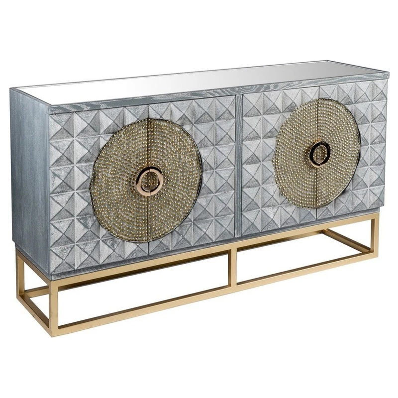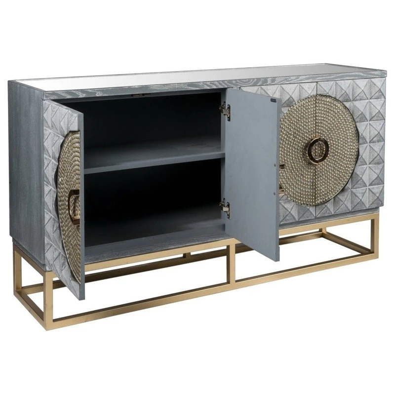 Be ready to wow your guests with this unique design. This gray wood sideboard has a blue undertone and gold studded doors and rose gold metal legs. Inside there is one shelve and plenty of space for storage.