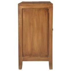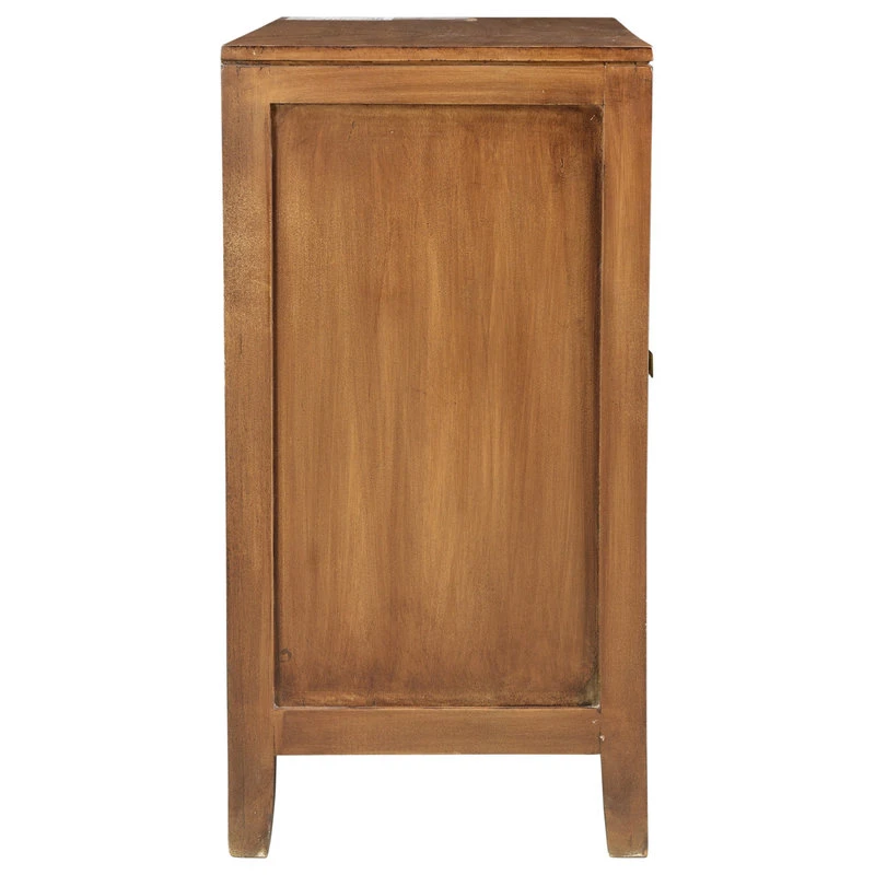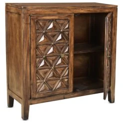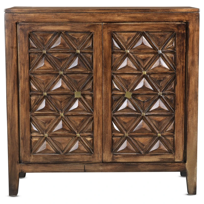 The Regent Accent Cabinet has the look and feel of a time-worn antique with the performance of a modern-day hand-crafted furniture piece. This solid wood cabinet features hand-carved geometric relief doors with gold metal accents that are striking in their detail and beauty. The unique style and burnt umber finish will complement interior styles from eclectic to traditional.