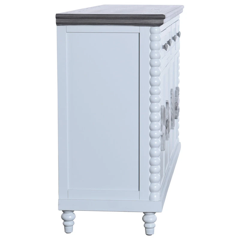 Built around a crown molding top and bobbin spool style corner posts, the Montauk cabinet is made using ash veneer and solids with a two tone finish. Crafted with metal ball bearing glides and concealed hinges for modern use, it features adjustable shelving behind its four cabinet doors. This striking piece is a centerpiece quality item perfect for living rooms, bedrooms, dining areas, and more.