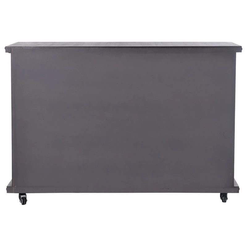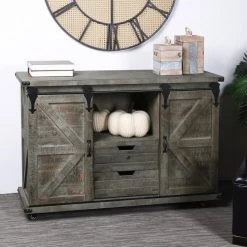 The Presley cabinet is a rustic style piece with a driftwood grey finish and black metal hardware. The cabinet has two barn-style rolling doors with slant board detailing on either side of the center section that features an open shelf and two drawers. This beautiful cabinet adds a unique look to your favorite room while providing ample storage space for media, books, or anything else you need to keep organized.