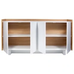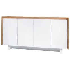 Skin sideboard stands for simplicity and pure functionality. The immaculate white is broken by the thin width wood veneer which surrounds the piece on its outside, and covers the whole piece inside. With four doors and lots of storage space, all that is seen are the marvelous lines of this amazing piece suited for living, dinner rooms or even kitchens. Assembly is required.