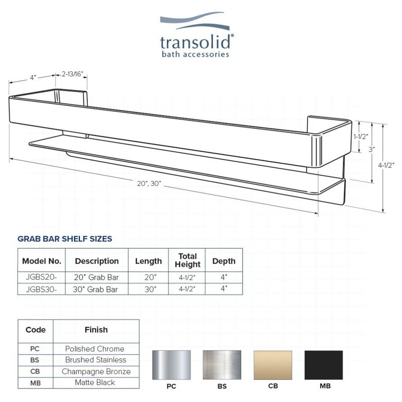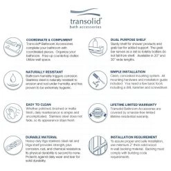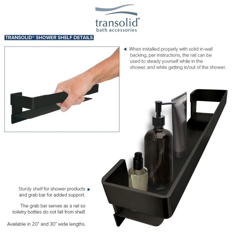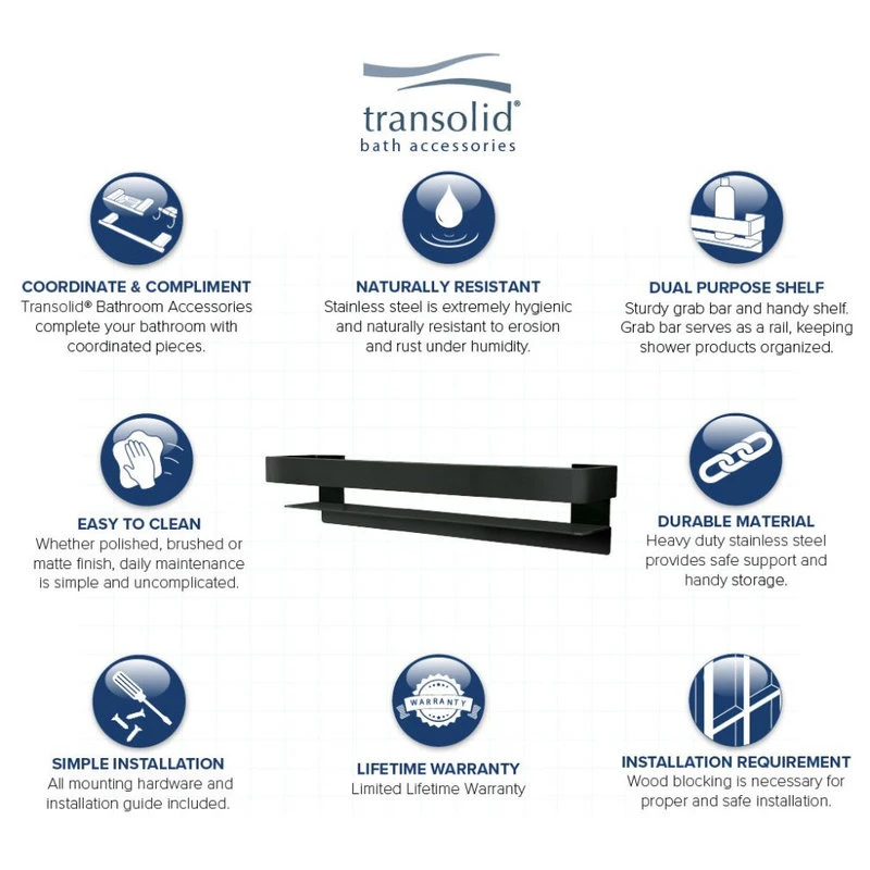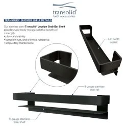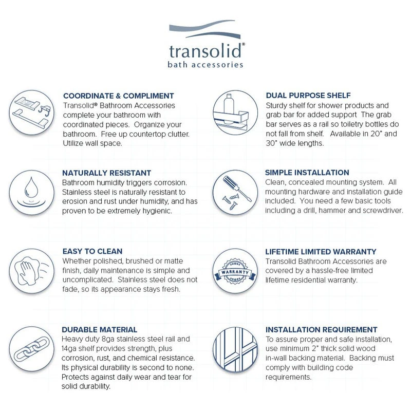 Transolid stainless steel grab bars shelves are a beautiful, easy-to-install addition to Transolid Titan, Prodigy, Expressions, and SaraMar solid surface walls, or any other solid surface or tile shower. Achieve peace of mind with durable shelving with a featured rail that wonβt let your shower products fall. Corrosion, rust, and chemical resistant material ensures this sleek design will add to your space without adding to your to-do list.