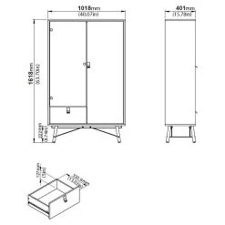- Four adjustable shelves, three fixed shelves and one drawer for storage