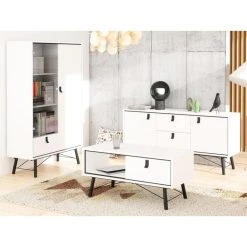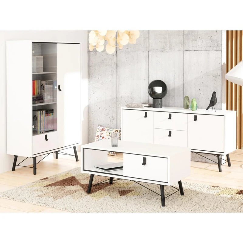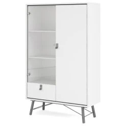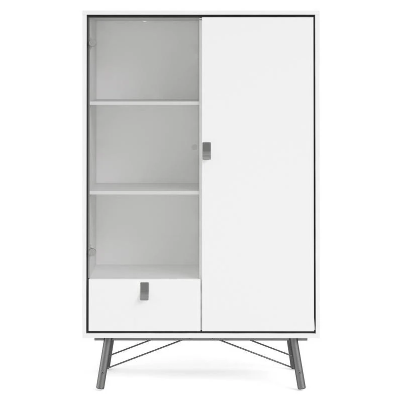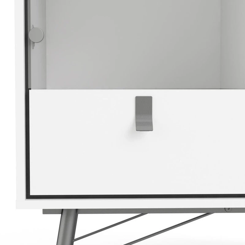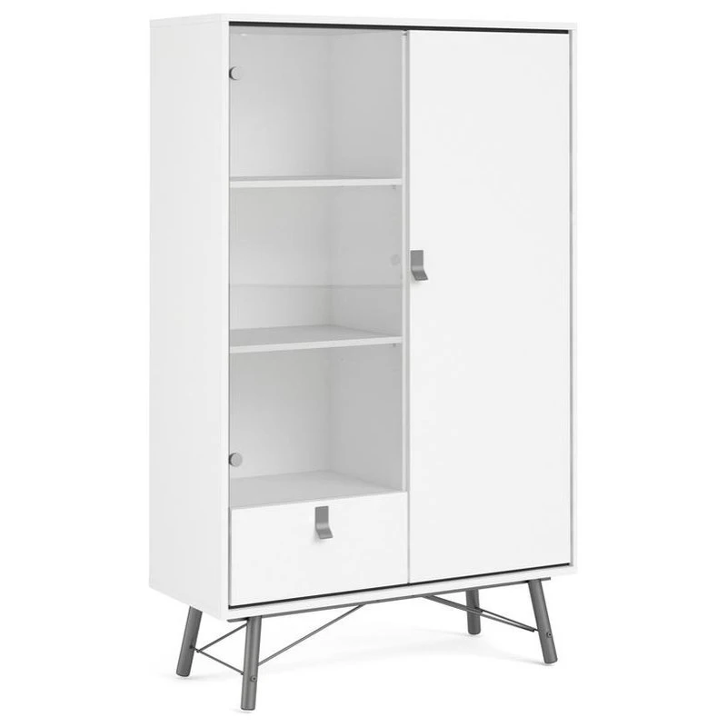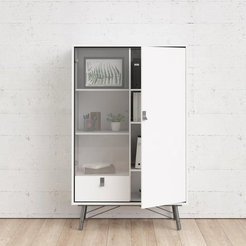 Create a calming atmosphere with the Ry 1 Drawer China Cabinet with 1 Door & 1 Glass Door. Inspired by the tranquility of Ry, a small Danish city White represents the Scandinavian spring light and black illustrates the rich soil. The china cabinet offers one drawer & one solid door for concealed storage and one glass door to display decorative glassware and accessories while the black metal handles allows for easy opening and closing. The two tone inner frame and angled solid wood legs connected by black metal bars mimics the sunlight shining through the leaves on a forest walk. The Ry collection is Danish designed with the calming, crisp air of Ry never far from mind and made in easytoclean foil surface. Complete your living space with other items from the Ry collection.