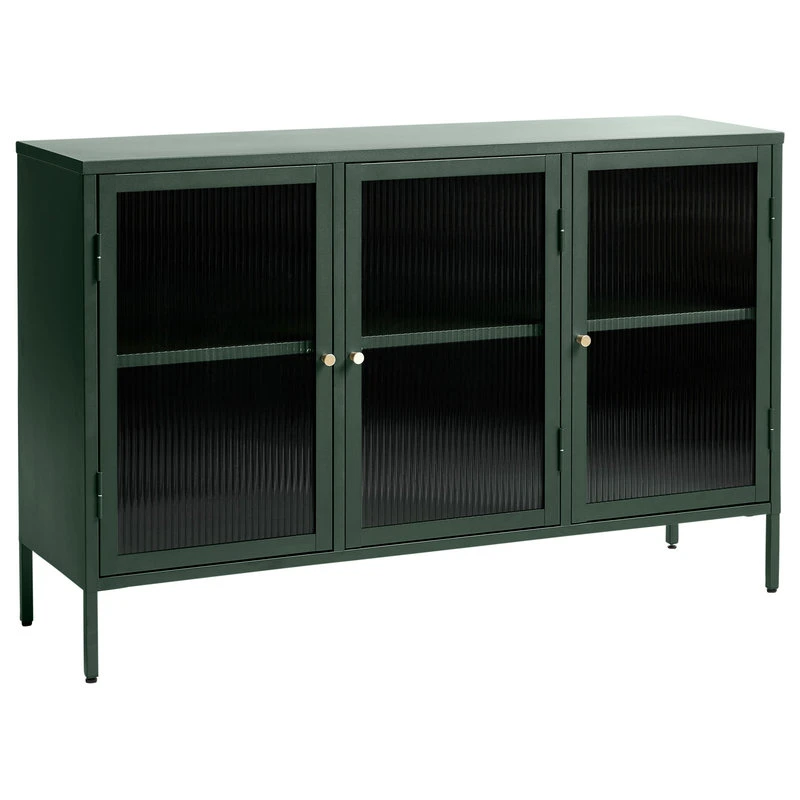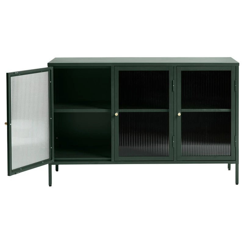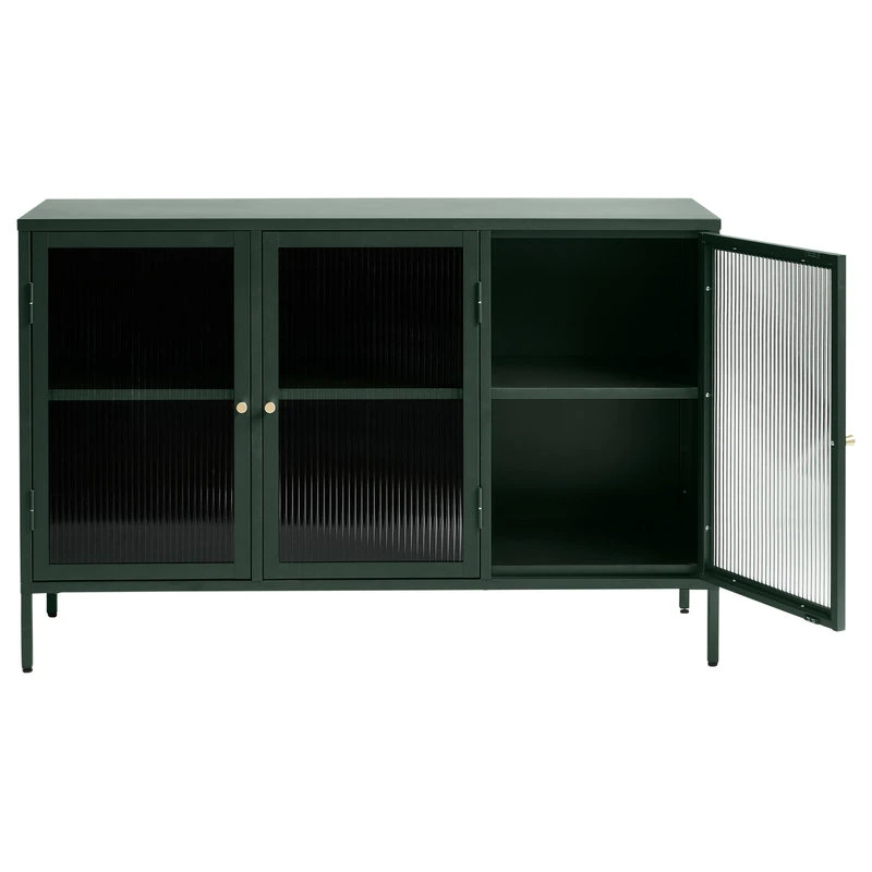 Enjoy a more refined take on the modern design aesthetic with this metal sideboard. This metal three door cabinet is designed with three glass panel door fronts, two shelves, and simple metal framework, making it the perfect home for your favorite pottery, books, and other collected curiosities.