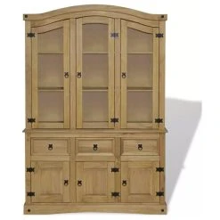 This high-quality wooden sideboard is a piece of furniture in the Mexican ‘Corona’ style. The waxed pine exudes a rustic Mexican charm that will make the display cabinet a great addition to your living room. This sturdy and robust crockery cabinet is crafted from solid pinewood. The top nine compartments are ideal for displaying glassware or dinnerware, but can also be used for keeping a large amount of books, magazines, CDs, files etc. well organized. The glass doors allow you to display the items and keep out the dust. The three drawers and three cabinets below provide ample space for private belongings. Delivery includes a hutch and a buffet. Assembly is easy.