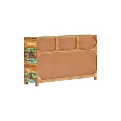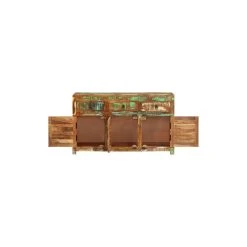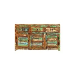 This sideboard will be a perfect choice if you are looking to add a touch of rustic charm to your home decor. This storage cabinet is handmade from solid reclaimed wood, a combination of reclaimed timbers including teak, mango wood, pinewood, beech, etc. These woods are recycled from old buildings such as factories, sheds and boats. This makes it a fantastic environmentally friendly option in furniture making. As every piece is handmade, colors vary with many blues, greens, creams and sometimes oranges, reds and pinks shades revealed. This even means each one is unique! The sturdy top is ideal for displaying photo frames, vases, fruit baskets, or other decorative items. Additionally, 3 drawers and 3 doors provide ample storage space, which will keep your items dust free and clutter out of sight. Important note: The color may vary from piece to piece, making each of our sideboards unique; the delivery is random.