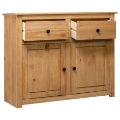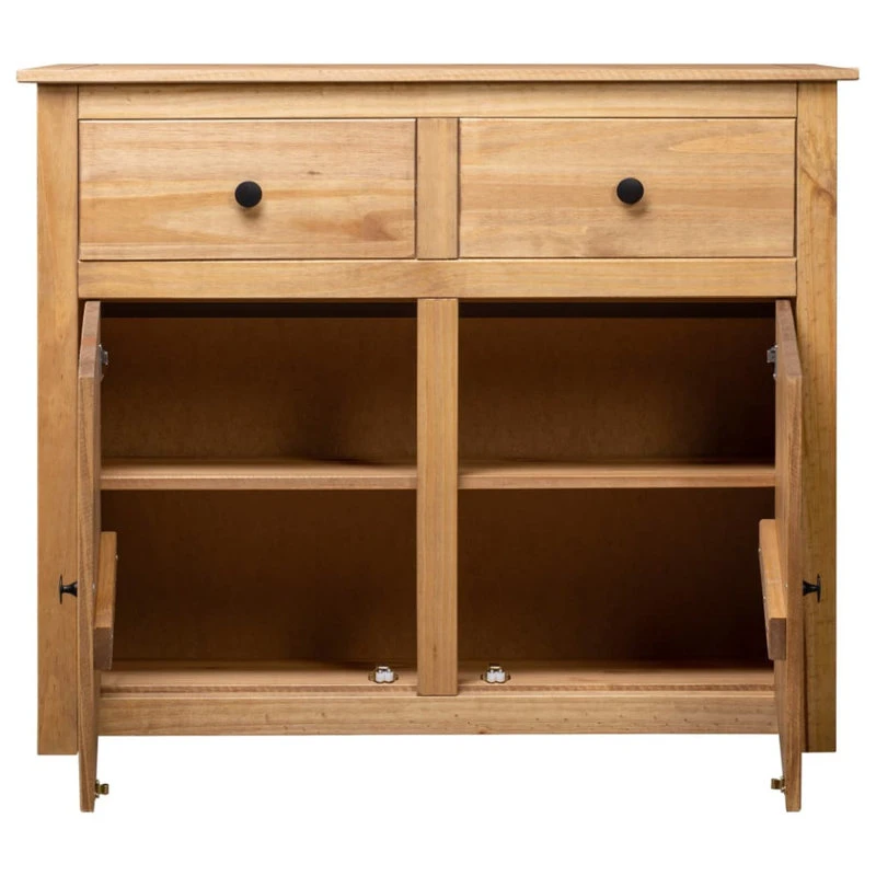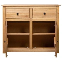 Featuring a rustic and trendy design, this solid wooden sideboard will make a decorative as well as practical addition to your decor. Designed with 2 drawers and 2 doors, the sideboard keeps your magazines, books, DVDs and multimedia devices well organized and within reach. Its sturdy top is ideal for placing decorative items such as vases or potted plants. The cabinet is made of solid pine wood. Every step of the process is carried out with the greatest care, be it polishing, painting or lacquering. The exquisite craftsmanship and the aesthetically-appealing wood grains make every piece of furniture unique and slightly different from the next. Important note: colors and grains may vary from piece to piece, making each of our cabinets unique; the delivery is random.