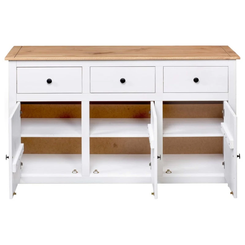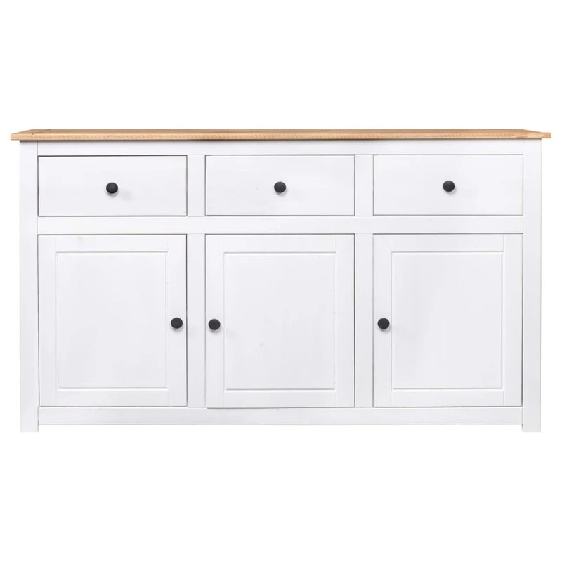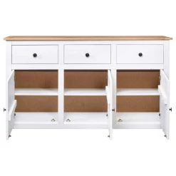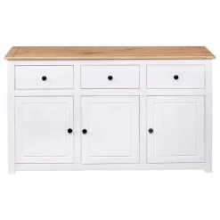 Introduce an air of elegance and convenience to your interior with our solid wooden sideboard! Made of solid pinewood, this drawer cabinet is exceedingly durable and sturdy. The side cabinet offers large storage space with 3 drawers and 3 compartments. Additionally, the sturdy tabletop is ideal for displaying decorative objects such as photo frames, potted plants, vases, etc. It is easy to wipe clean with a dry cloth. The storage chest is easy to assemble.