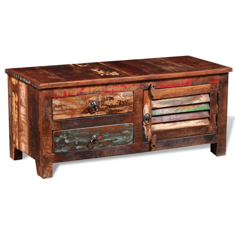 This antique-style wooden side cabinet, coming with 1 door and 2 drawers, offers you certain storage space and helps you to maintain your items in great order. You can also put a desk lamp, toiletries or some decorations on the sturdy top surface. This TV/Hi-Fi cabinet is made from reclaimed wood, which means that every piece of furniture is unique and slightly different from each other. The furniture made from reclaimed wood has characteristics of different woods like teakwood, acacia, mango wood, saal wood etc. Reclaimed wood is solid, stable, durable, and beautiful. The nail holes or clear-faced grains bring their history with them and invite another generation to permeate them with their own. Keeping this piece of furniture at home will show your concept of resource conservation, environment protection and sustainable development. Pure handmade craftsmanship adds the vintage spectacular style to the cabinet and feasts you with exotic flavour. Every process of recombining, polishing, painting and waxing is elaborately prepared. The antique side cabinet will surely be a perfect addition to your home! Important note: colors vary from piece to piece, making each of our cabinets unique; the delivery is random.