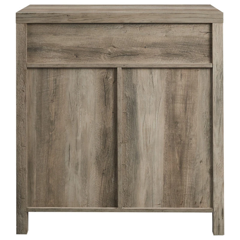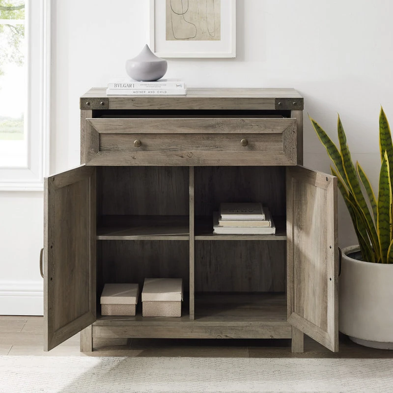 This 30-inch farmhouse accent cabinet is full of closed storage options since it comes with two-doors and a drawer with telescoping metal drawer glides. Behind the doors there is an adjustable shelf. The exposed hardware and handles feature an antique bronze metal finish that enhance the rustic tone of this storage unit.