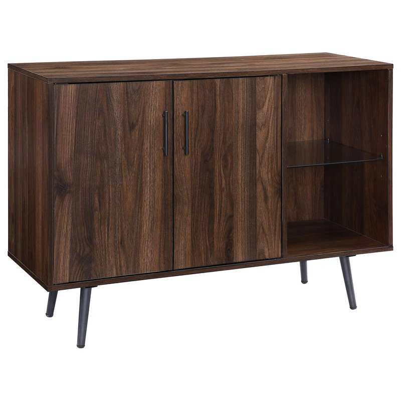 Take this adaptable console into just about any room in your home for added storage space. From your living room as a TV stand that can fit up to a 48-inch TV with cord management in the back or sideboard for your household essentials, in your kitchen as a buffet for your dishes and your kitchen necessities, or in your bedroom as a storage console keeping your room organized. The combination of materials from metal accents, glass, laminate, and the color contrasts make this piece exude a mid century modern and transitional style. Both outside and hidden shelving make it easy for you to make things tidy in your home. It features adjustable shelves and rubber feet with magnetic doors to best fit your needs.