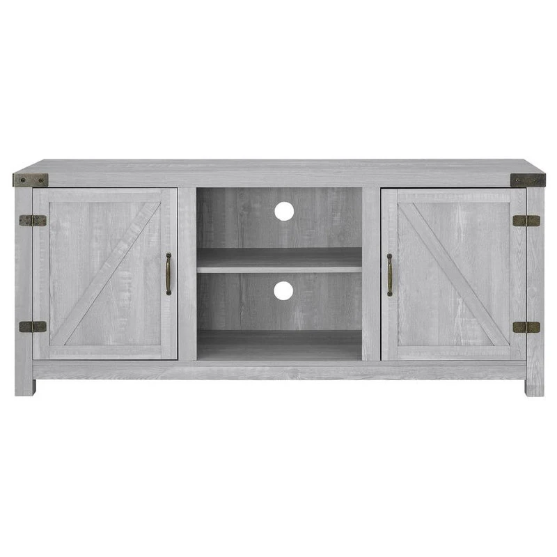 Include our TV stand in your living room to give the area a charming, country feel. Features concealed storage space behind the barn styled side doors with adjustable shelving to fit your media and accessories, while having a mix of rustic and modern farmhouse style. This entertainment center is made of durable, high-grade MDF and can support most TVs up to 65-inches. As a storage console, it will keep your living room looking neat while also giving it a homespun feel.