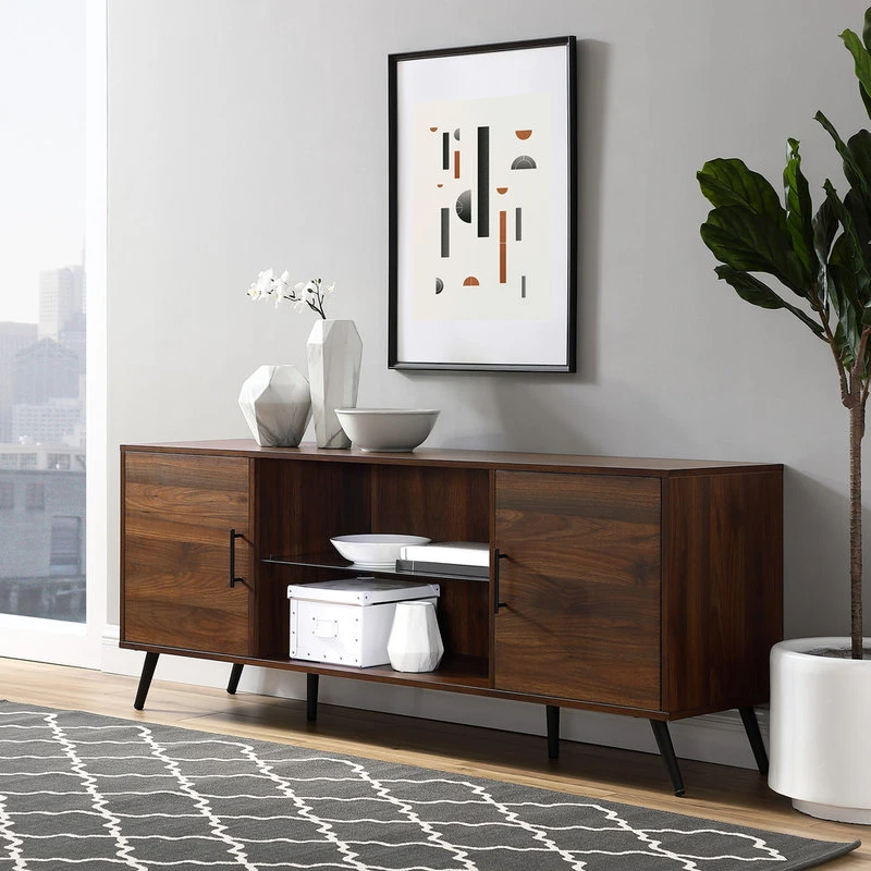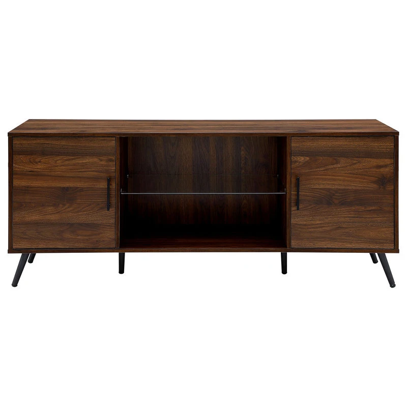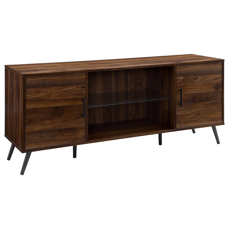 Improve you living room with our TV stand. Featuring a middle glass shelf and closed storage on both sides for you to have a place for your media essentials or decor, whether in your living room or bedroom. The sleek metal hardware, angled legs, and boxy frame create an overall mid century modern aesthetic. With a cord management feature in the back to keep things tidy, adjustable shelves, and adjustable rubber feet to prevent it from sliding, this storage console will make a practical addition to your home.