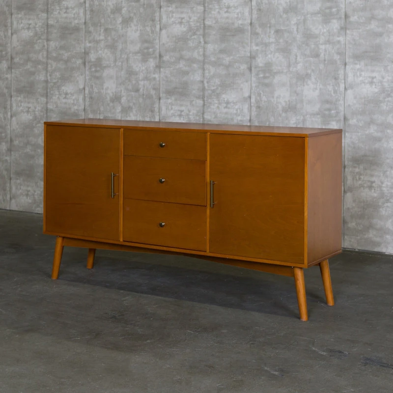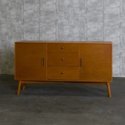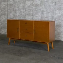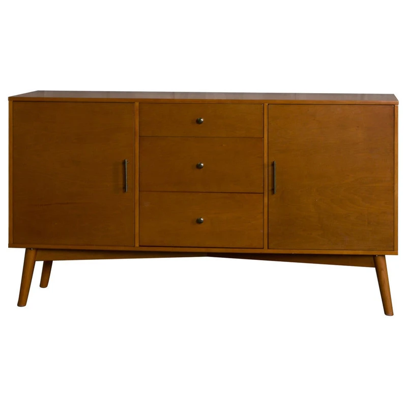 The Mid Century Modern Wood TV Stand blends Mid Century style with contemporary taste. This Stand features three drawers and two cupboards. Within the cupboards, you’ll find convenient adjustable shelves. A warm acorn finish fits many modern interiors.