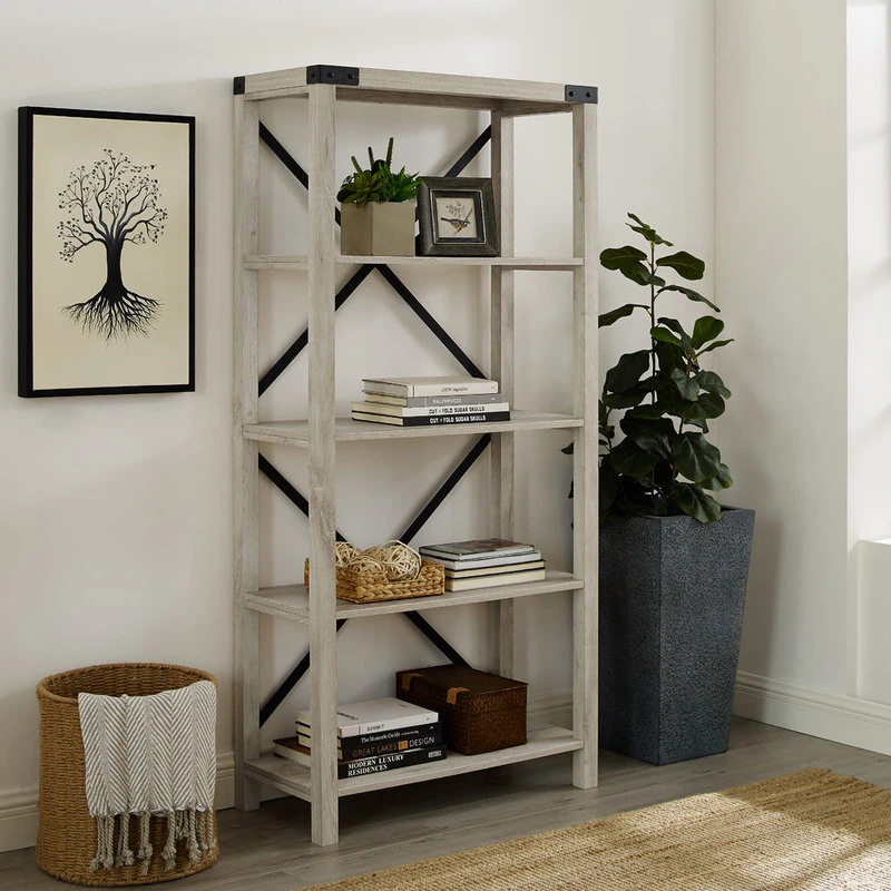 Provide shelving for your collectibles, books, and decor with this 64-inch bookcase with four spacious shelves. In a high-grade MDF, durable laminate, and metal design featuring metal accents on the corners and x-shaped backings. With a farmhouse style for a rustic, industrial appearance to your home. Add in your entryway, hallway, bedroom, kitchen, or home office to store your items and keep them organized.